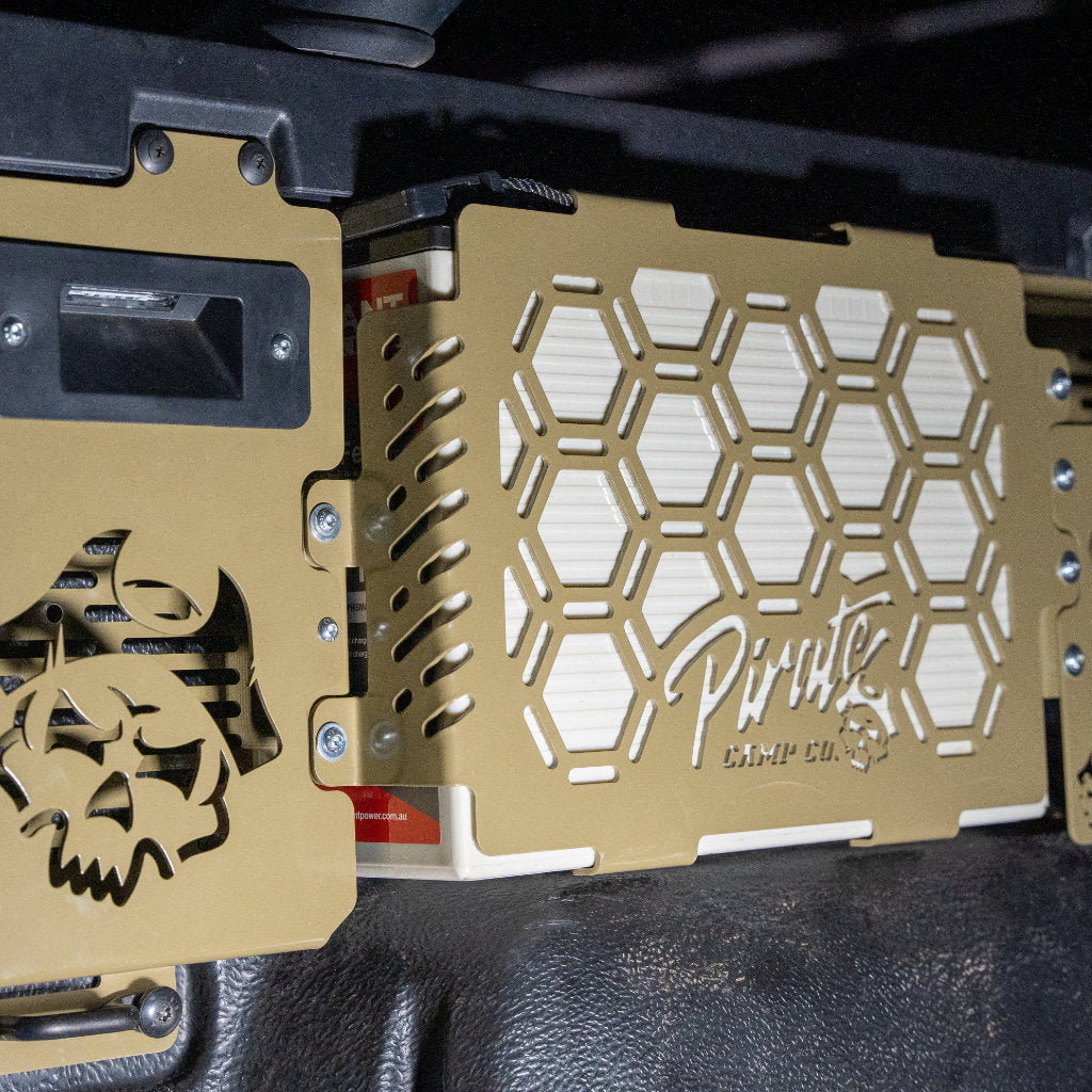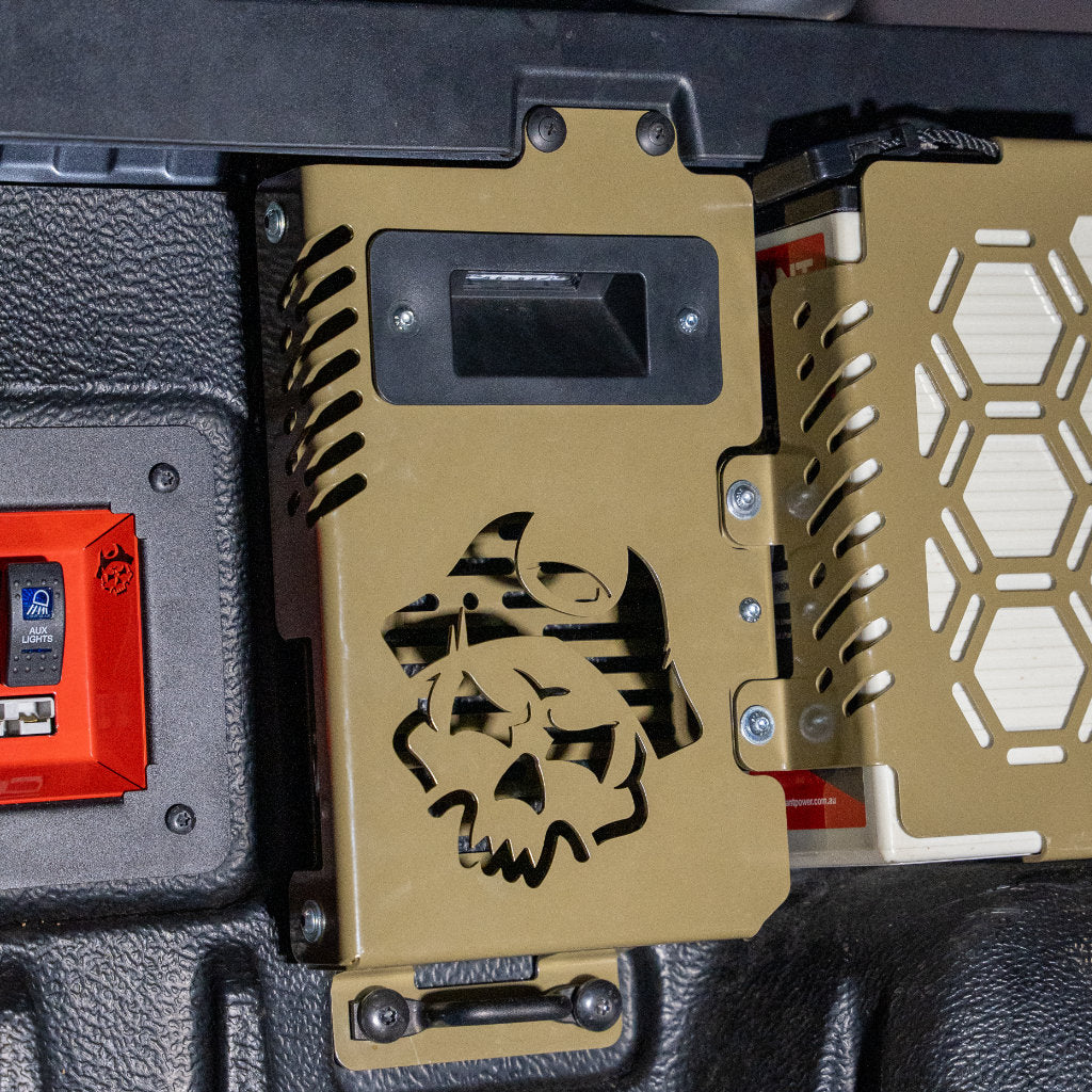 We’ve designed this battery mount specifically to fill up the dead space within the tub. It sits above the wheel arch, has a molle panel storage pocket at the front, has a provision for a BCDC, retains the factory light & runs all the wires so they’re hidden directly back to your tub switch panel. We’ve designed this around the Giant Power 170Ah lithium battery.
