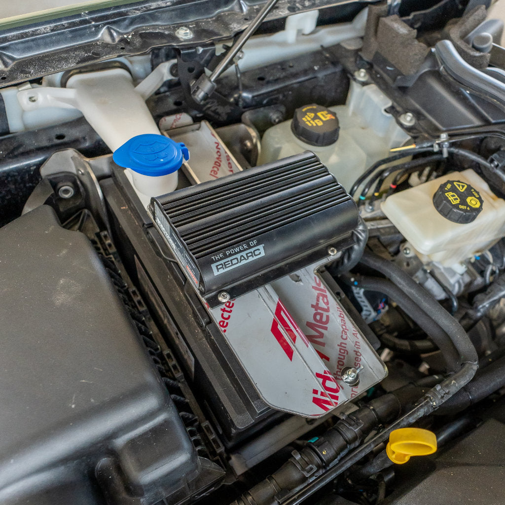 This bracket drops straight into the factory-designated second battery space under the bonnet — no modifications, no drilling. A tidy, permanent home for your aux battery.